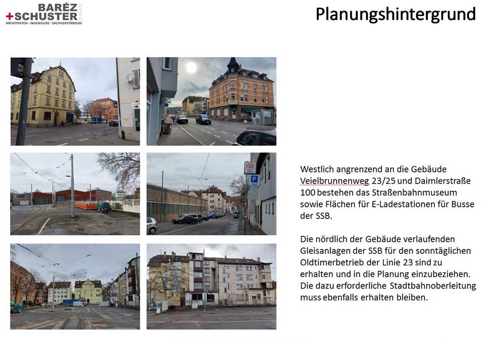 Westlich angrenzend an die Gebäude Veielbrunnenweg23/25 und Daimlerstraße 100 bestehen das Straßenbahnmuseum