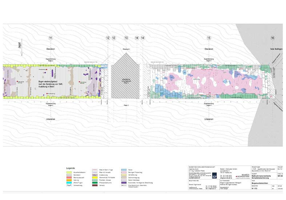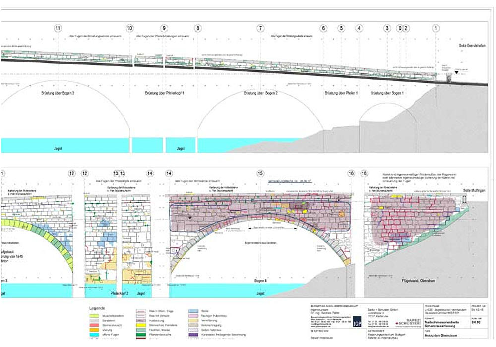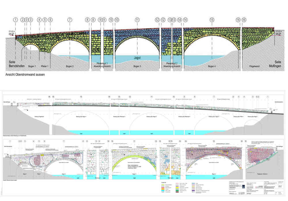 Gutachterliche Stellungnahme, maßnahmeorientierte Schadenserfassung und Instandsetzungskonzept für die denkmalgeschützte Naturstein-Bogenbrücke über die Jagst, in Mulfingen-Heimhausen (Hohenlohe) Baujahr 1754.
