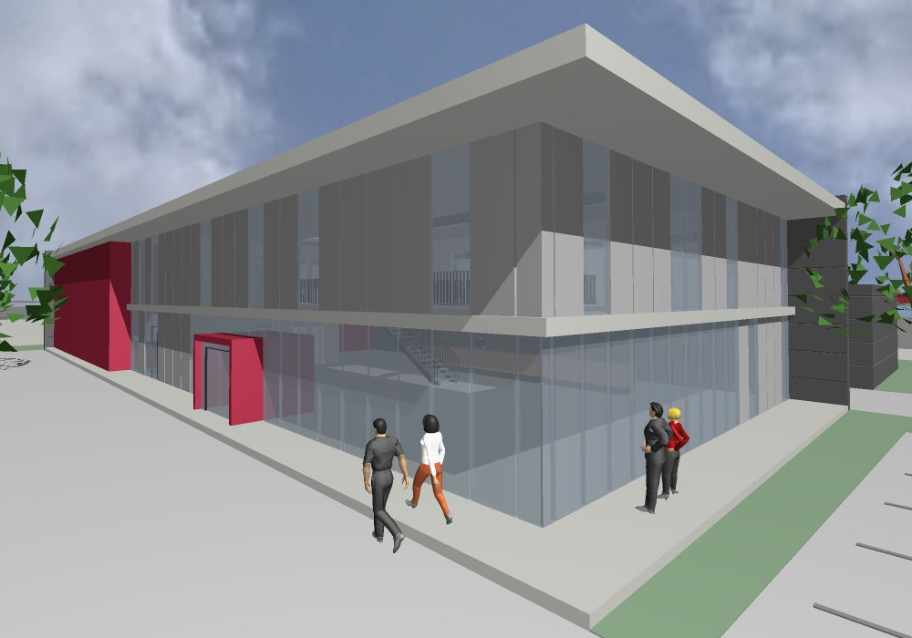 Eine Stahlkonstruktion mit vorgestellter massiver Wand aus Gasbeton-Mauerwerkdient der Ausstellungshalle.