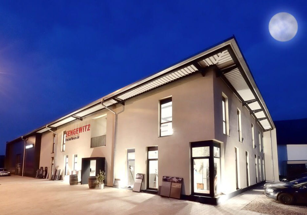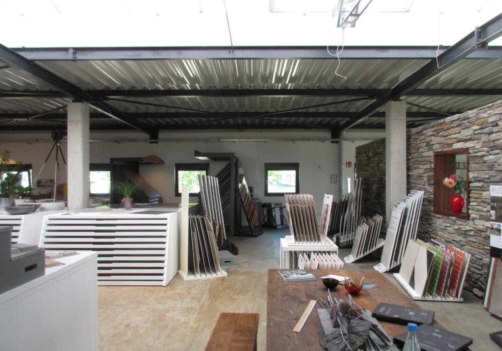 Die Ausstellungshalle als Schaufenster zur Fliesenwelt wurde durch die Rahmengestaltung des Gebäudes unterstrichen. Diese dient als Warenpräsentation und Verkaufsraum.