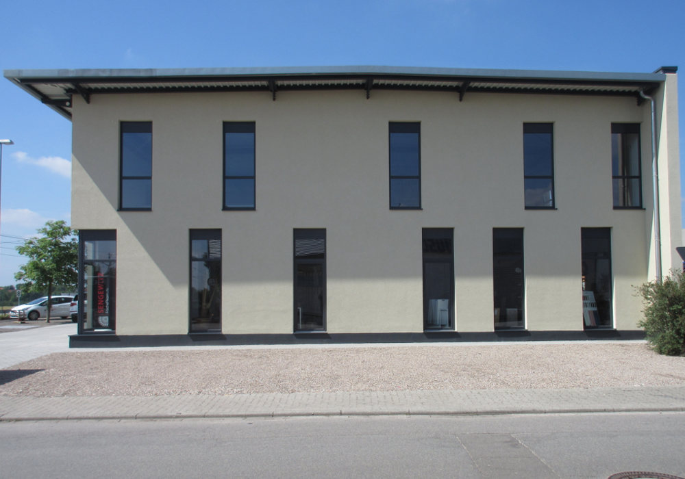 Neubau einer Ausstellungs- und Lagerhalle für einen Fliesenhändler (Fliesenverkauf) in Schriesheim. Der Neubau ist eingeschossig mit einer Galerieebene in der Ausstellungshalle. Daraus ergibt sich eine 2- teilige Konstruktion unter einem Dach, bestehend aus dem Lagergebäude und der Ausstellungshalle.