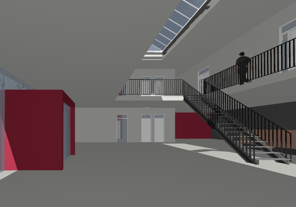 Eine Vorgartenzone dient der Ausstellungsfläche, welche als Cafébereich genutzt werden kann.