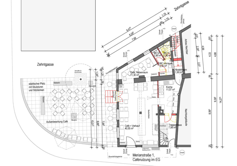 Im Erdgeschoss soll ein Café/ Bistro mit den erforderlichen Nebenräumen eingerichtet werden. Im Obergeschoss ist, in Ergänzung zur Cafénutzung, die Einrichtung eines Veranstaltungsraumes für ca. 50 Personen für geschlossene Veranstaltungen wie Familienfeste u.ä. vorgesehen. Die übrigen Räume im Gebäude sollen für diese Nutzungen als Nebenflächen (z.B. Büro, Personalraum, Lagerflächen) genutzt werden. Das Konzept sieht eine denkmalverträgliche Umnutzung für das Gesamtobjekt vor, bei welcher Eingriffe in die historische Substanz des Objektes weitgehend vermieden werden können.